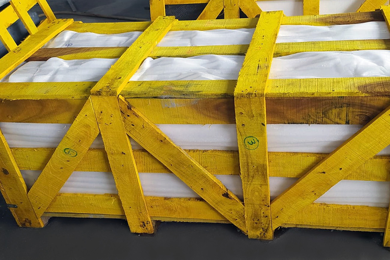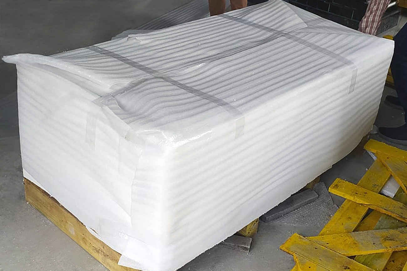 Before putting granite products into crates, our packaging experts cover each slab or tile in high-quality plastic film. This helps lock out dust, moisture, and scratches. In order to avoid friction and other types of damage, we insert EPE foam sheets or thermocol sheets between each granite surface.
