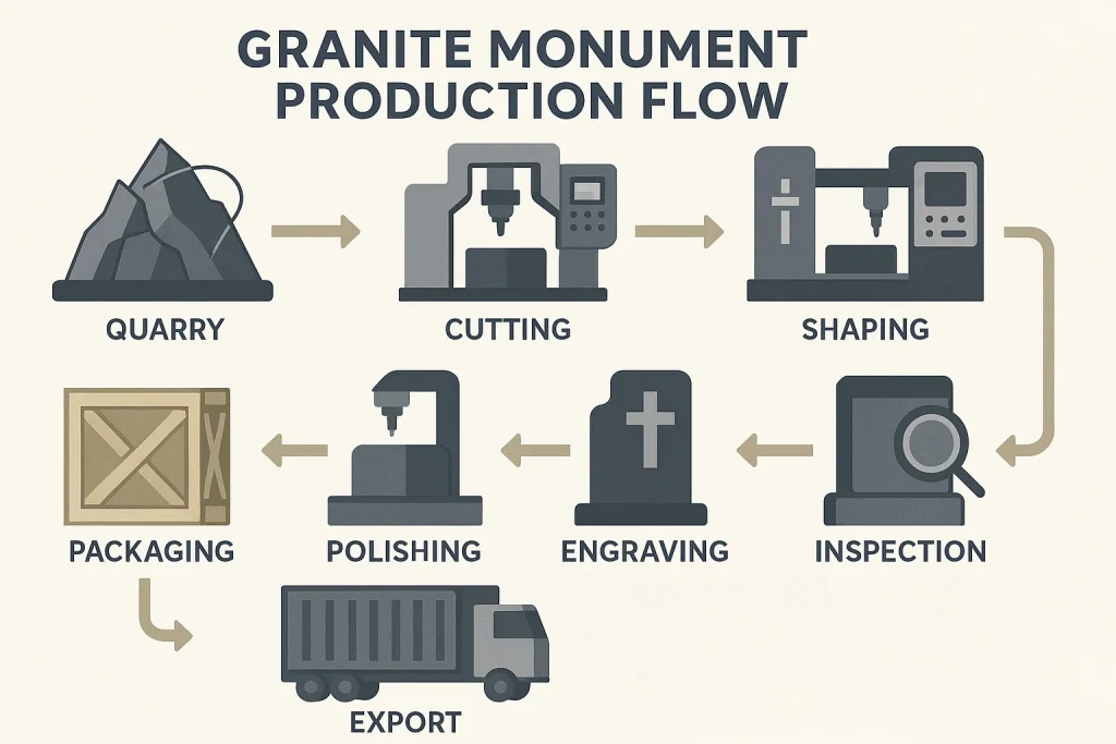 While other suppliers outsource the work, Regatta has its own in-house facilities for the production of granite monuments. This vertical integration enables us to oversee every aspect of production — from block cutting and shaping to polishing, engraving, and quality control. Our factory combines the latest technology with old-world craftsmanship, and uses diamond-wire block cutters and CNC machines to guarantee that every piece is strong and appealing. By controlling the entire process, not only can we ensure the highest quality, but we can also minimize lead times to meet the tightest of deadlines without compromising quality. To our overseas customers, this means a reliable source whose priority is that they get both the quality and the delivery time they require.