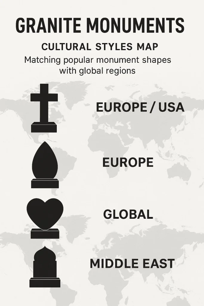 Each is personalized to reflect cultural traditions — designs may include Islamic-style headstones with restrained engravings, European ogee and teardrop shapes with a crisp, modern clarity, or American-style flat markers meant for architectural requirements in cemeteries with lawn-level installation.